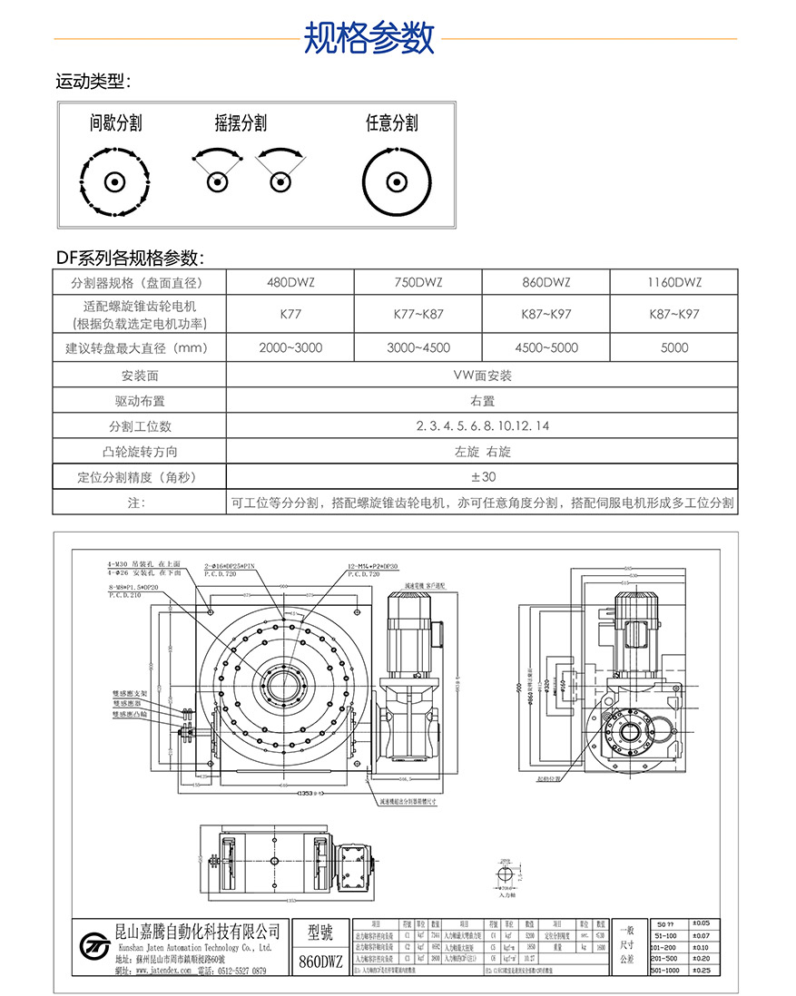 外观功能与平台桌面型相似,但DWT具有:大盘径旋转盘面且承受超大轴向负载 和垂直径向压力的特性。针对不同的型号,安装转盘直径范围:Φ2000~Φ5000mm,运转负 载范围:1T~8T之间,可满足重工行业的特殊性要求,此系列可工位等份分割,搭配螺旋锥 齿轮驱动,亦可任意角度分割,搭配伺服电机驱动形成多个工位的分度,满足客户多种要求, 输出轴同样具有大孔径空心轴,可将动力之源:电,油,气等管路置于空心孔内,目前广泛 应用于:汽车相关产业、检测设备、新能源设备、食品类设备、激光设备等重工行业。