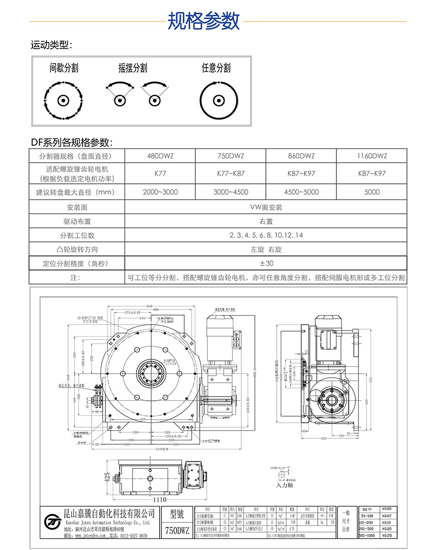 外观功能与平台桌面型相似,但DWT具有:大盘径旋转盘面且承受超大轴向负载 和垂直径向压力的特性。针对不同的型号,安装转盘直径范围:Φ2000~Φ5000mm,运转负 载范围:1T~8T之间,可满足重工行业的特殊性要求,此系列可工位等份分割,搭配螺旋锥 齿轮驱动,亦可任意角度分割,搭配伺服电机驱动形成多个工位的分度,满足客户多种要求, 输出轴同样具有大孔径空心轴,可将动力之源:电,油,气等管路置于空心孔内,目前广泛 应用于:汽车相关产业、检测设备、新能源设备、食品类设备、激光设备等重工行业。